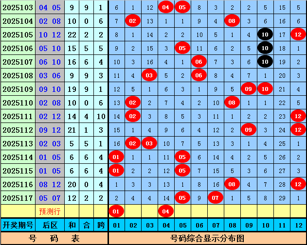 前区奖号分析: 前区龙头:上期龙头开出05,近期出现频率较低,前10期龙头散布在1-14区间,小 号龙头出现比例较低,本期看好小 号龙头回补,矜恤龙头号码05。 前区凤尾:上期开出凤尾号码29,最近10期凤尾号码散布范畴在16-35区间,其中29以上的凤尾出现比例为30%,本期提防29以下的凤尾号码,矜恤凤尾号码29。 前区和值:最近30期前区和值平均值为85.8,最近10期前区和值平均值为80.0,比中位和值高4.0个点位,上期前区和值为83,对比前期高潮8个点位,本期展望和值链接高潮,出当今90-100区间。 前区奇偶比:最近30期前区奖号奇偶个数总比例为71:79,总体来看偶数上风相比显着;前10期前区奖号奇偶比例为22:28,偶数奖号相对活跃;上期前区奖号奇偶比为3:2,本期展望奇数号码链接大热,重心看羡慕偶比5:0。 前区大小比:最近30期前区奖号大小个数总比例为71:79,总体来看小 号占有上风;前10期前区奖号大小比例为23:27,小 号相对热出;上期前区奖号大小比为3:2,本期展望大号链接大热,重心看好大小比3:2。
