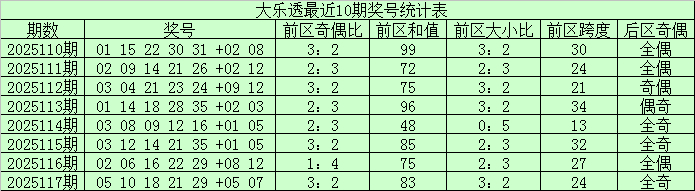 大乐透第25117期奖号为:05、10、18、21、29+05、07。其中前区和值为83,奇偶比为3:2,大小比为3:2。后区为一大一小、全奇组合。