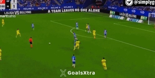 第45+6分钟,比利亚雷亚尔的狂放球,巴埃纳将球吊入禁区,阿约泽-佩雷斯头球攻门笔直,1-1扳平比分。