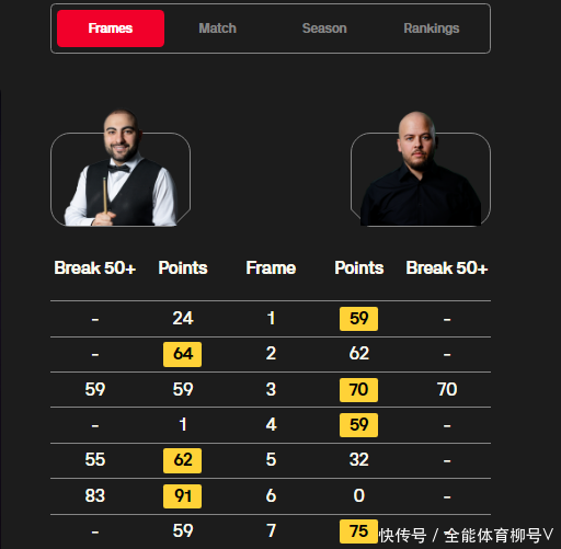 第二局,两东说念主伸开拉锯战,在胶著的比赛中,阿尤里以64-62两分险胜,1-1扳平比分。第三局,两边伸开对攻,阿尤里打出单杆59分,布雷切尔打出单杆70分,并以70-59胜出,2-1再次擢升。
