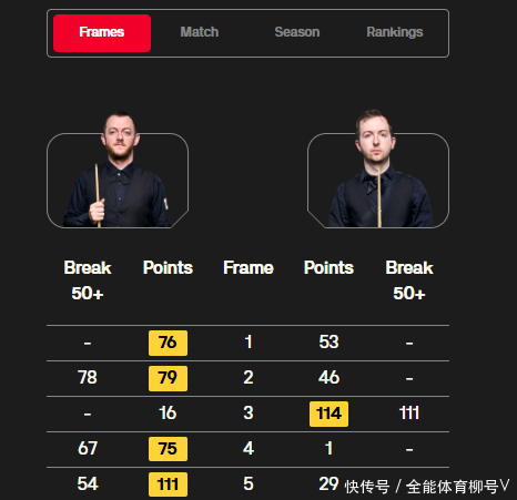 第五局,毛糙的局间休息回归之后,艾伦又打出单杆67分,68-0零封莱恩斯,3-2反超比分。第六局,连丢三局之后,莱恩斯找到火爆进犯手感,他轰出单杆108分,108-0零封艾伦,比分追成3-3,两边回到归拢说念跑线。